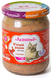 м’ясо кролика, субпродукти птиці, субпродукти яловичі (м’яса та м’ясопродуктів не менше 59%), рис, гарбуз, мікроелементи та вітаміни.